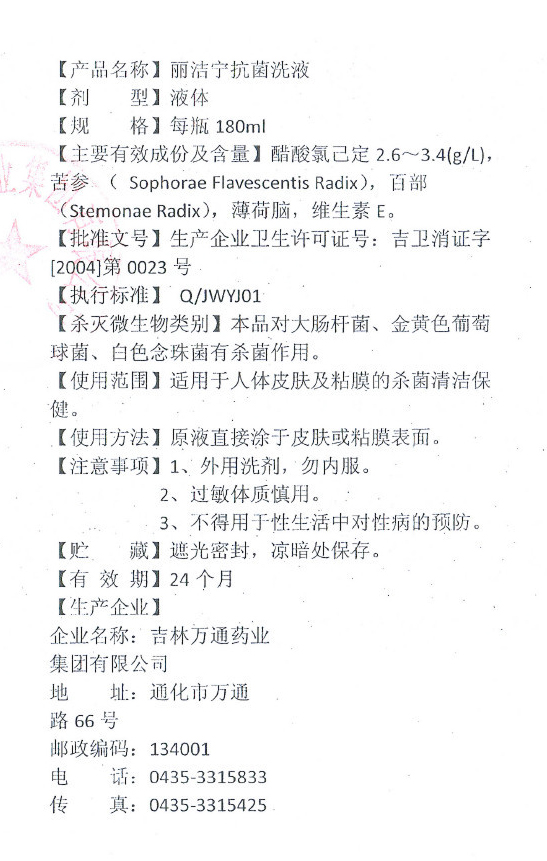 醋酸氯己定2.6~3.4(g/L),苦参(Sophorae Flavescentis Radix),百部(Stemonae Radix),薄荷脑,维生素E。