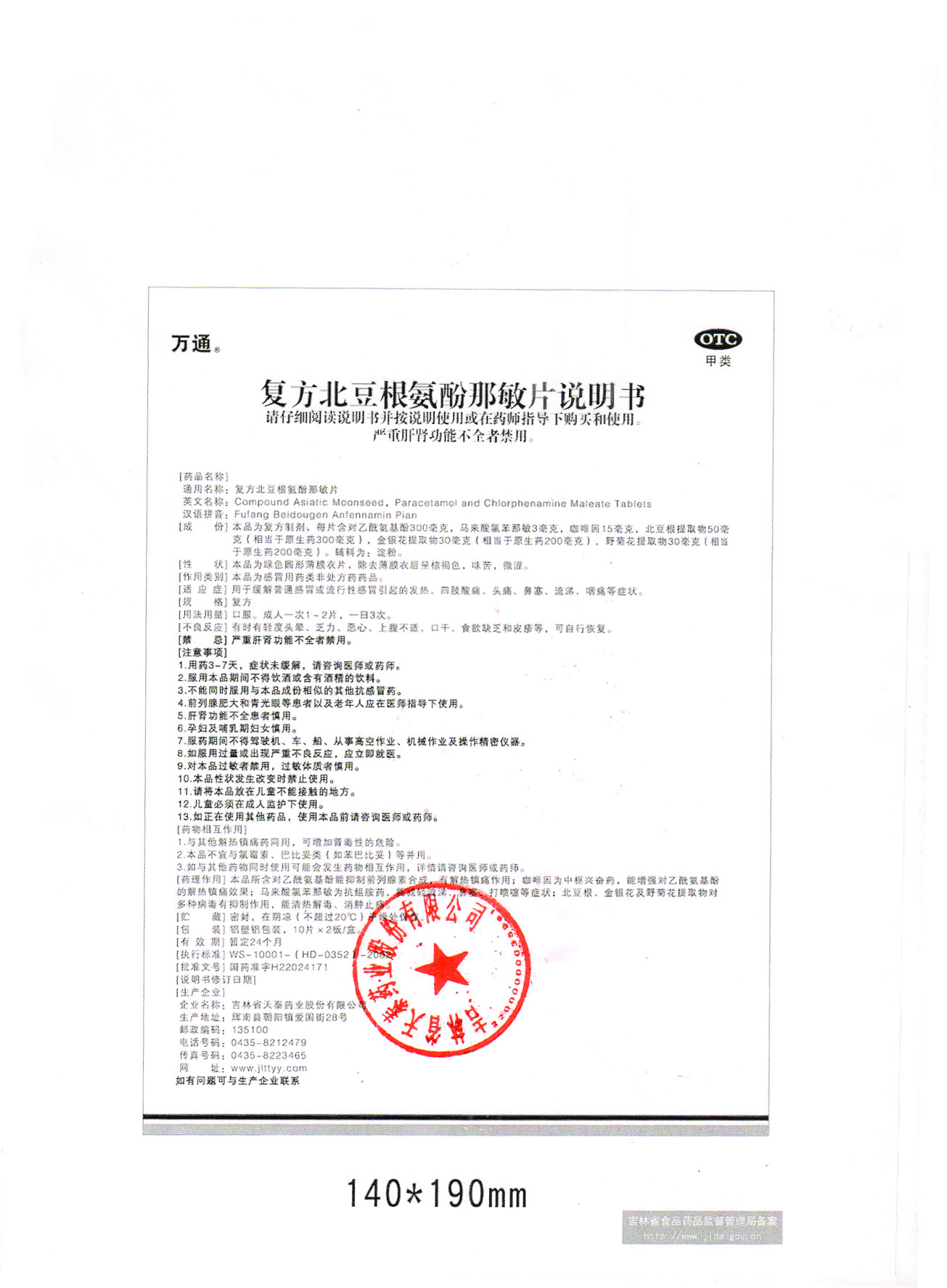 本品每片含对乙酰氨基酚300毫克,马来酸氯苯那敏3毫克,咖啡因15毫克,北豆根提取物50毫克(相当于原生药300毫克),金银花提取物30毫克(相当于原生药200毫克)。辅料为:淀粉。